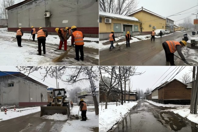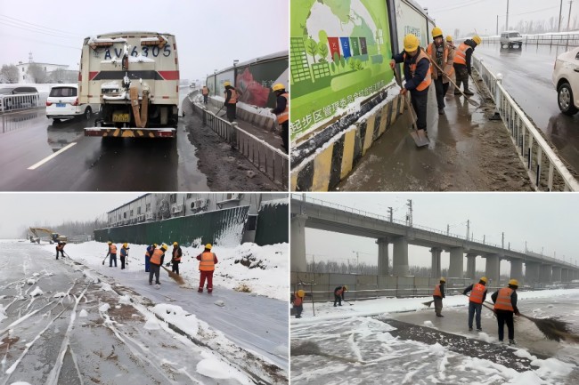 城建六公司黃崗路穿黃隧道項目部及人行天橋項目部針對309國道輔路、幸福寺路等處的積雪結冰情況,迅速部署,立即組織工人開展掃雪除冰作業。黨員干部和青年職工帶頭,分工協作,高效清除通行隱患,保障路段通暢,以快速響應和務實行動守護群眾平安,展現了國企為民服務的責任與使命。