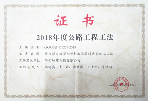 集團“城市隧道微型鋼管樁加固軟弱地基施工工法”被評為2018年度公路工程工法