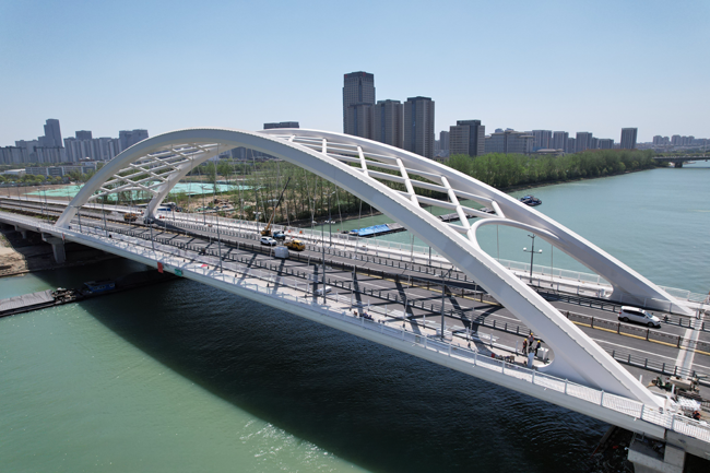 集團承建的二里橋路跨京杭運河節點工程(曲江大橋)項目連續上跨濱河西路、京杭運河、東外灘路(規劃),主橋采用“鋼箱提籃拱”結構,由拱肋和交織的橫撐組成,相依相靠,形成穩定結構。設計靈感源自揚州“月亮城”的文化意象。側觀橋體,兩向內收攏的拱肋形如彎月,網狀橫撐交織成輕盈的弧線;夜間燈光亮起時,橋影與水中明月相映成趣,恰似“二分明月落長河”的詩意畫卷。橋型勾勒出了古樸靜謐的揚州,穿越千年,風姿如故,它宜清風、宜月色,人與自然相互包容,與揚州打造“文化旅游名城、生態宜居名城” 的規劃相得益彰。